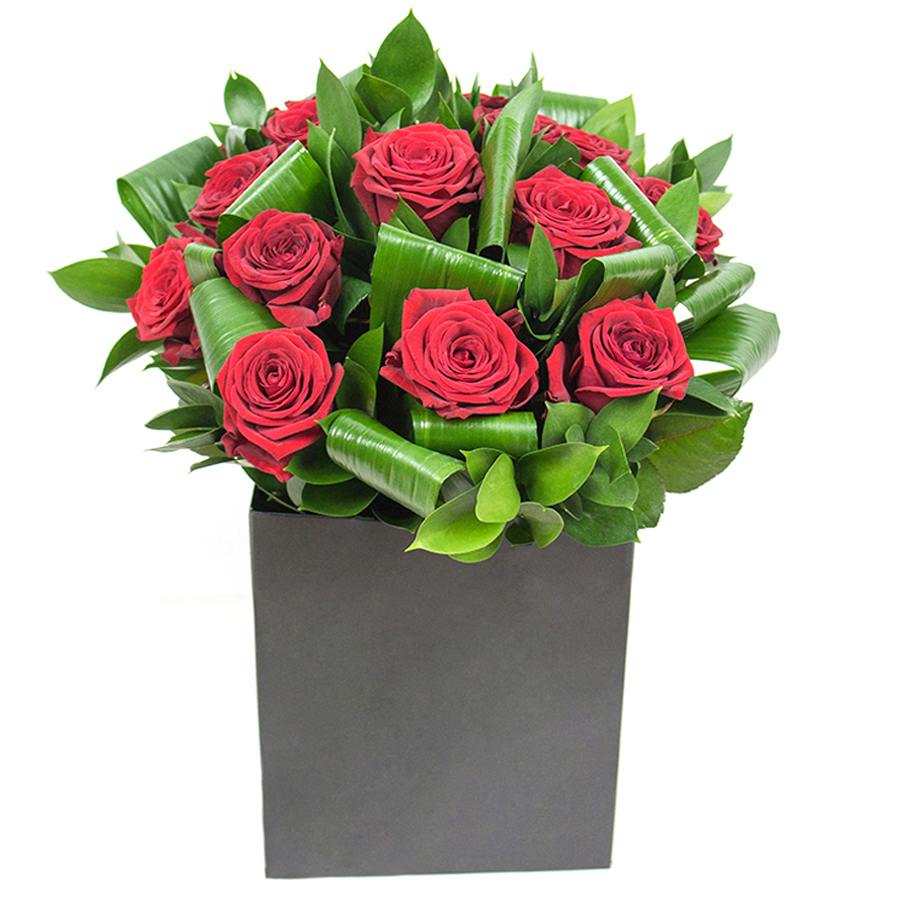 Our bouquet showcases the exquisite beauty of bold red roses complemented by vibrant aspidistra leaves and lush ruscus, creating a striking and elegant floral display.