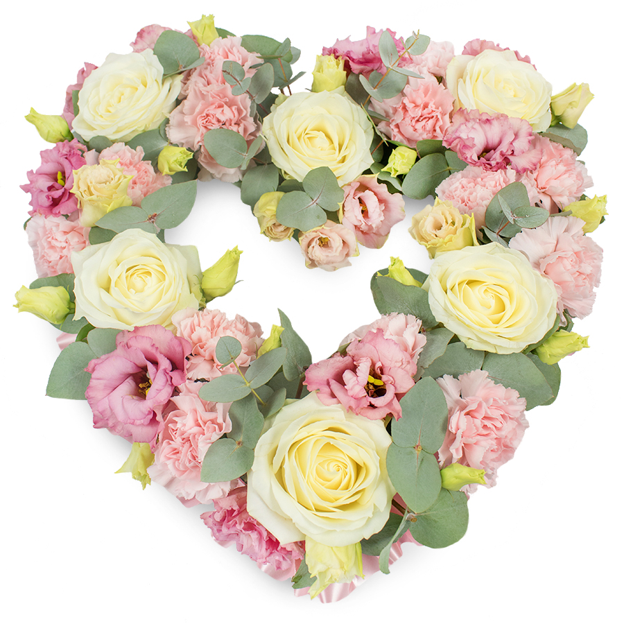Express your love and gratitude with our Open Heart Tribute bouquet. Combining white roses, pink carnations, pink lisianthus, and Eucalyptus leaves, this arrangement is both beautiful and unique.