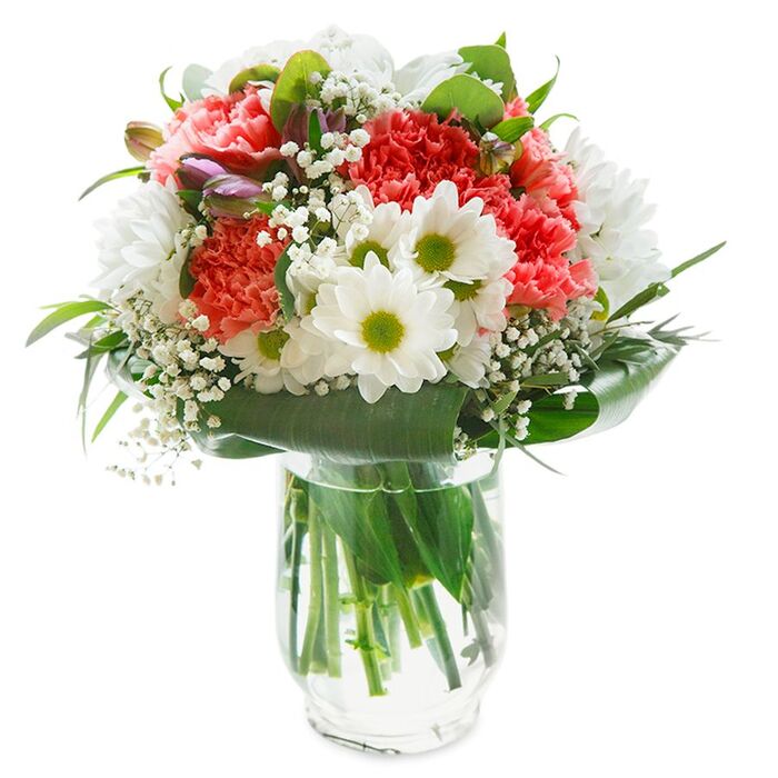 Bring warmth and beauty to any setting with our charming bouquet, featuring a delightful mix of snow-white chrysanthemums, airy gypsophila, and light pink carnations, arranged with vibrant aspidistra leaves.